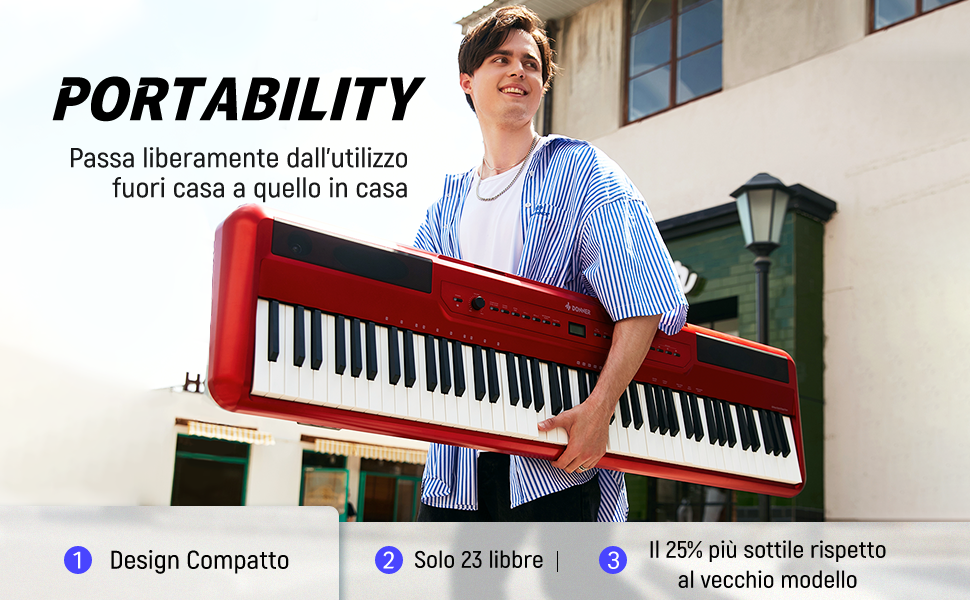 - Il corpo del pianoforte pesa solo 23 libbre ed è il 25% più sottile rispetto a tutte le versioni precedenti. Il design esterno aerodinamico e la superficie satinata sono eleganti ed eleganti.